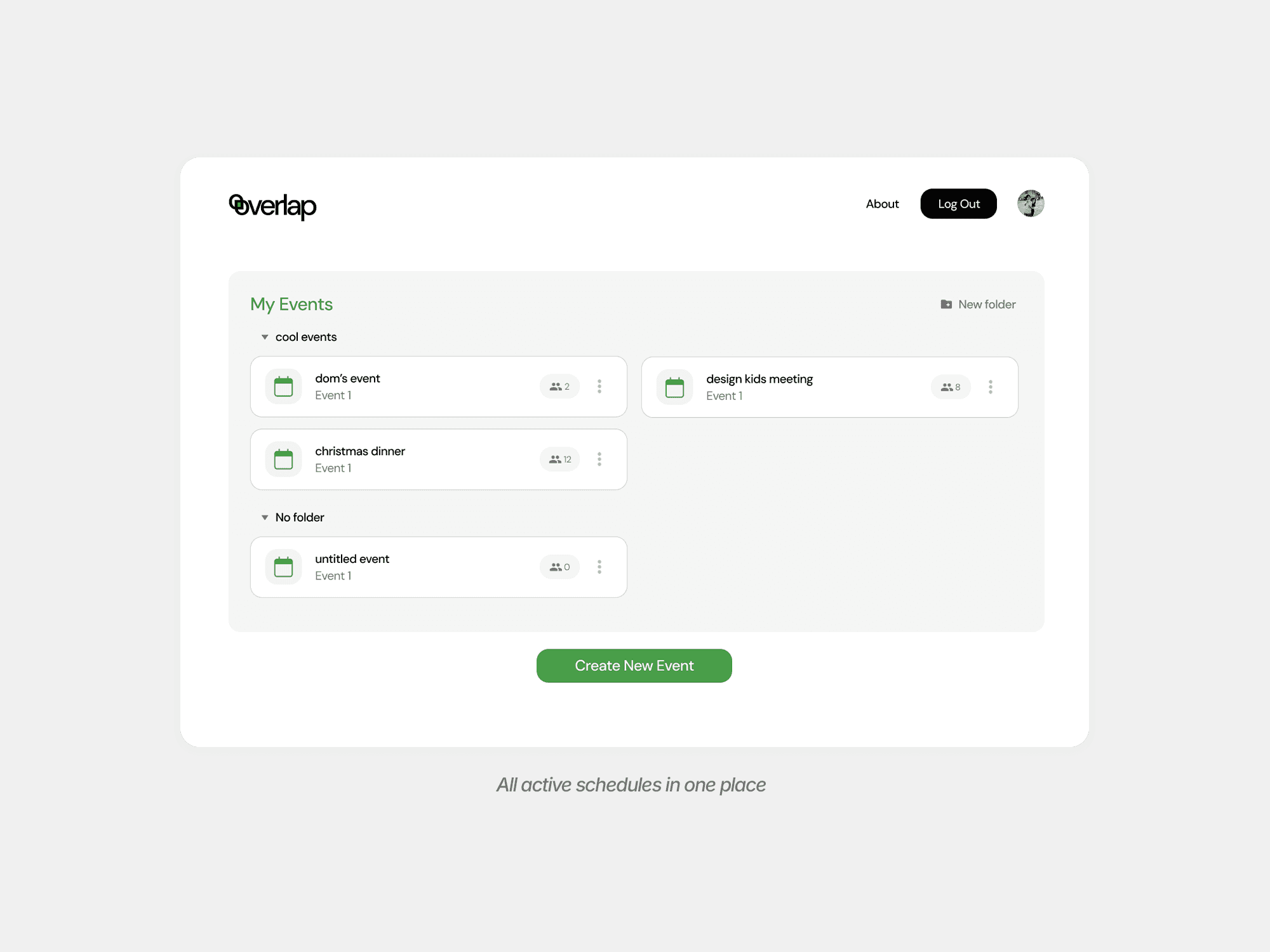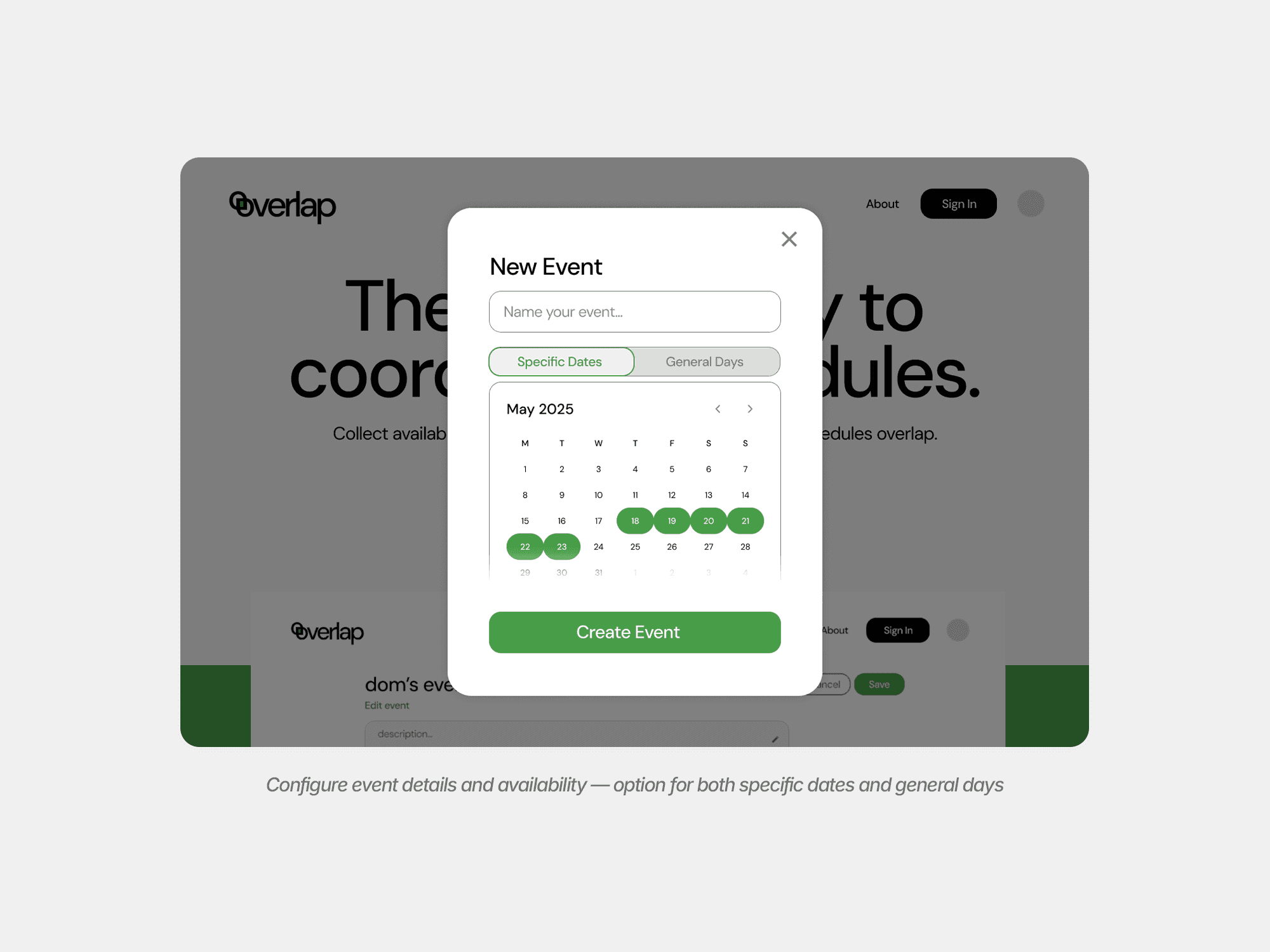 Overlap reimagines group scheduling as a complete, end-to-end experience rather than a single-use utility. The interface introduces clear visual hierarchy, improved contrast, and a refined availability grid that makes overlap immediately legible. Users can create events through flexible scheduling formats, input availability with confidence, and optionally integrate with their own Google, Outlook, or Apple calendars to reduce manual effort. An account system and event dashboard allow users to store, organize, revisit, and edit meetings over time — turning scheduling from a disposable interaction into something persistent and more pleasant to use.