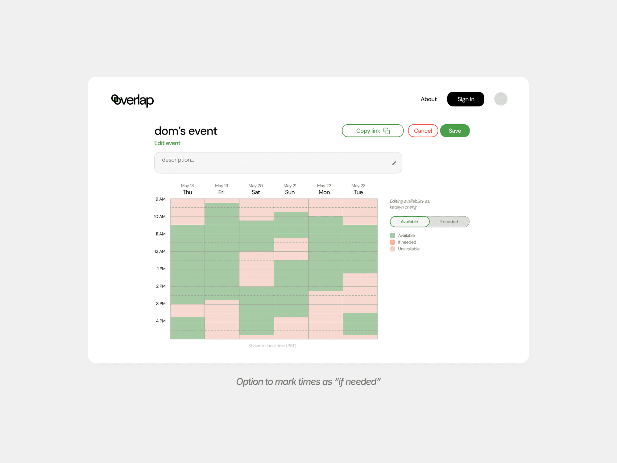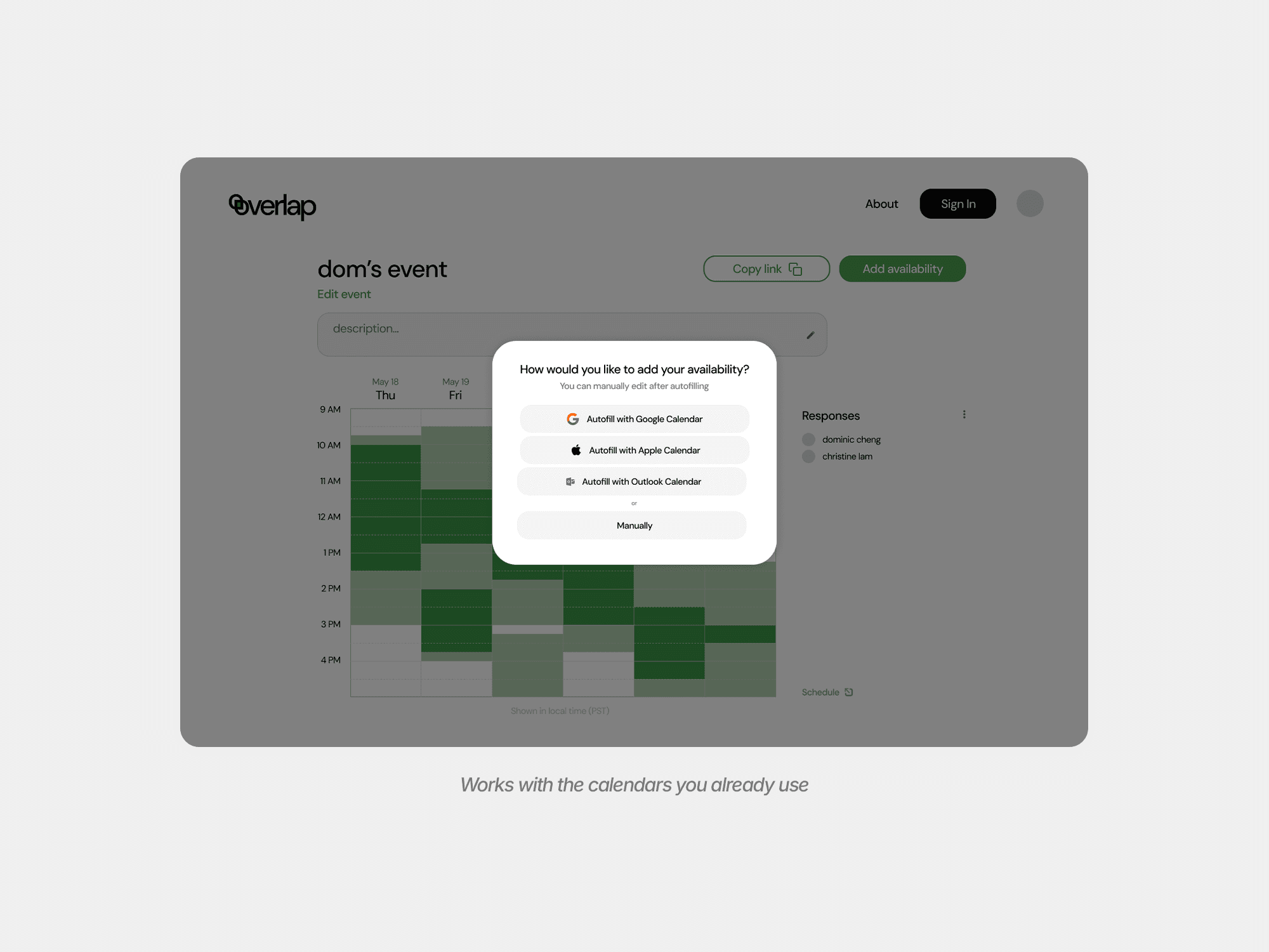 A modern scheduling tool designed to help groups quickly find mutually available times through a clear, intuitive, and visually structured interface.